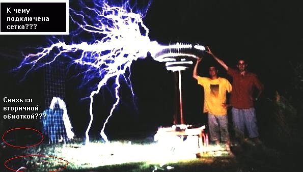 Как пацанов не бьет током? Смотрим фото. Видимо, к сетке брошен изолированный от земли провод от нижнего вывода вторичной обмотки. Она просто гальванически развязана от земли. Не видно как металлическая сетка установлена на земле, неизвестно сопротивление грунта и обуви экспериментаторов на ВЧ. Также, никто (почему?) не учитывает индуктивность человека (согнутой руки и т.д.) на больших частотах, она может оказаться существенной (большей чем индуктивность стримера). Кроме того, большая мгновенная мощность не показатель большой средней мощности (а какая она?), да, и токи высокой частоты ничего кроме нагрева кожи с человеком не сделают, максимум - ожоги, но это зависит от средней мощности.