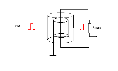 - на коаксиальный транс 10 витков тонкого коаксиала 50 Ом в ферритовых чашках подавался импульс допустим 100 нс. Выходное сопротивление генератора 0,07 Ом. При сопротивлении нагрузки вторички