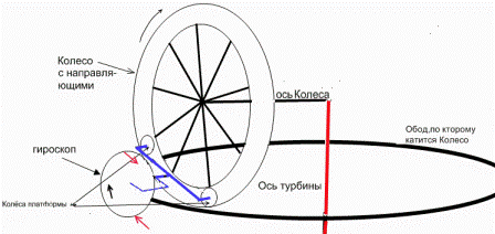 Выкладываю свой вариант гравитационной турбины с использованием эффекта смещения(раздвоения) центра тяжести.Знакомые с первыми постами этой темы и гироскопическим эффектом ,я думаю,смогут понять как она должна работать. Красными стрелками я указал действие гироскопических сил,действующих на гироскоп во время движения Колеса по кругу обода.Большое Колесо катится по ободу.Маленькие колёса платформы на которой закрепляется гироскоп свободно могут катиться по направляющим большого Колеса.После того как скорость вращения оси турбины достигнет определённой(не очень большой,зависящей от частоты вращения гироскопа) величины платформа с гироскопом примет положение когда переднее его колесо будет находиться над точкой соприкосновения Колеса с ободом Смещённый центр тяжести системы,состоящей из тележки с гироскопом и Колеса всё это время так же находится над точкой соприкосновения Колеса с ободом. .При дальнейшем увеличений оборотов турбины центр тяжести уйдёт вперёд по ходу движения Колеса от этой точки (согласитесь--тележка же не будет заползать наверх по направляющим) и оно уже начнёт двигаться по ободу за счёт этого смещённого центра тяжести создавая уже приращение энергий на оси турбины,то есть перейдя в режим СЕ.Гироскоп потреблять энергию при этом будет только на преодоление сил трения в подшипниках на которых вращается а они не очень,как вы знаете,большие. На вал такой турбины по всему кругу обода можно будет поставить не одно Колесо с тележкой а несколько,от чего мощность,им вырабатываемая, должна будет возрасти в разы. Вот,по сути, и первое возможное применение открытого мной эффекта