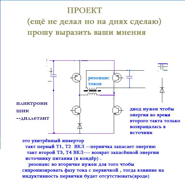и стал я кумекать как такой цикл реализовать на постоянке(чтоб энергия обратно в кондёр сглаживающий уходила) так и родился ухитрённый инвертор
