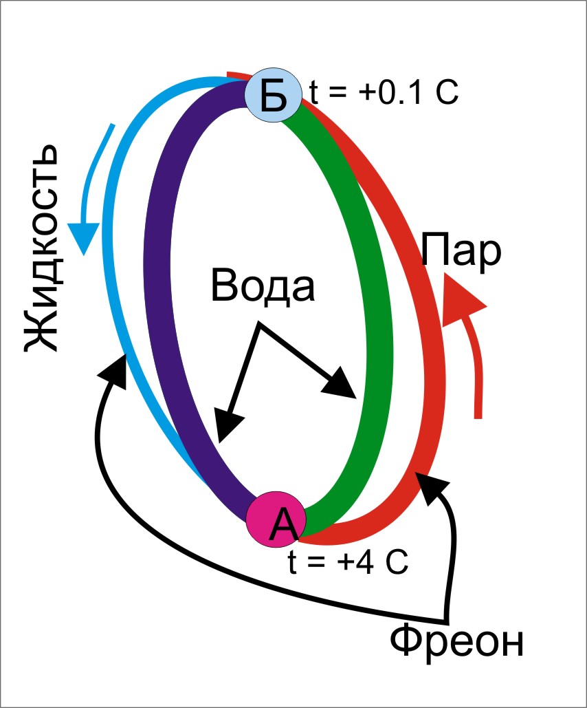 Что мы имеем... А имеем мы два контура - в одном из них вода, в другом какой-нибудь теплоноситель с низкой температурой кипения (например - фреон, сжиженный газ, аммиак или что-то подобное - далее “фреон”). Контуры теплоизолированы от окружающей среды и друг от друга, кроме точек А и Б. А в этих точках между контурами стоят теплообменники.