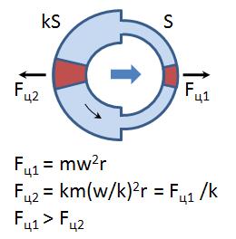 Я уже писал, что в большем сечении уменьшится линейная, а значит и угловая скорость жидкости (исходя из условий неразрывности потока) и уменьшится радиус, а поскольку центробежная сила прямопропорциальна массе, радиусу и квадрату угловой скорости выигрыша в силе не получится, будет баланс.