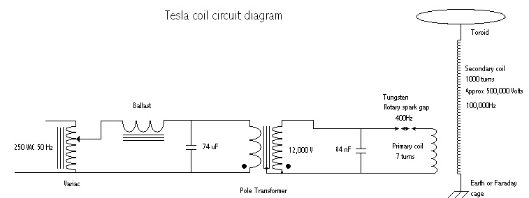 У Тесла используется обычный контур ударного возбуждения. Заряд конденсатора напряжением несколько киловольт через разрядный промежуток сбрасывается на первичную обмотку. Получается единичный импульс тока. Величина тока может достигать нескольких сотен тысяч ампер. Этот ток создает импульсное магнитное поле большого градиента, которое возбуждает во вторичном контуре затухающие колебания на частоте, определяющейся индуктивностью катушки, межвитковой емкостью катушки, и емкостью между тором на конце катушки и землей, поскольку нижний конец заземлен.