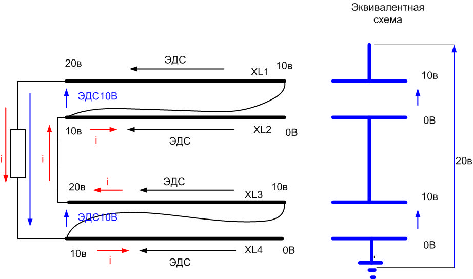 Если сложить две батарейки в паралель, то получится то же напряжение но с большим током отдачи и меньшим внутренним сопротивлениям.