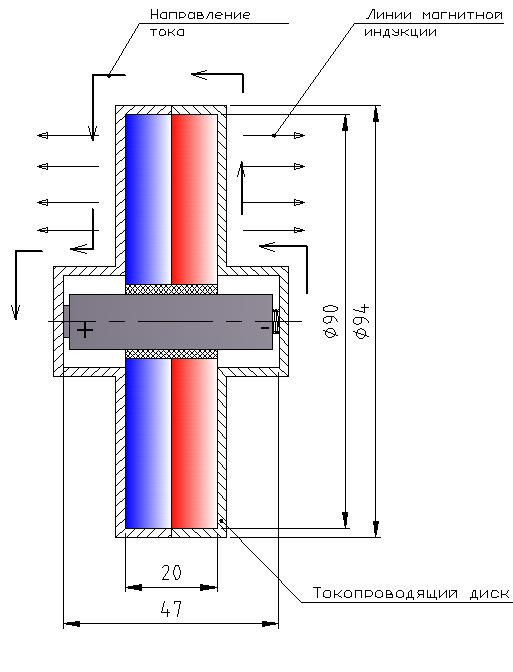 Кстати, некоторое время назад, развивая идею "простейшего униполярного двигателя", ну того самого, где батарейка, кусочек провода, шуруп и магнит, мне пришло в голову такое вот устройство... Неработающее к сожалению. 😏 Но если бы оно заработало - мммммм... Это было бы нечто 😎 . Хотя, если извернутся, и сделать батарейку внутри диска неподвижной(!!!) относительно оси вращения (то есть чтоб она не вращалась вместе с внешним диском), возможно что устройство заработало бы... Забавная игрушка получилась бы. 😕