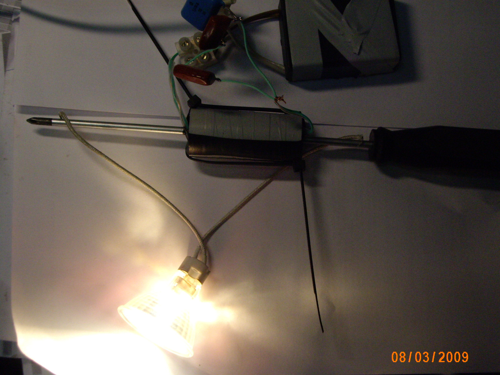 Если долго мучаться, что-нибуть получится. На картинке лампа галогеновая 50Вт 12В. Питаемся от так называемого "электронного трансформатора" для галогенок. Конденсаторы для устранения резонанса с преобразователем, напрямую как-то взаимодействуют, напряжение явно больше, либо транс сгорает, либо лампа. Явно индуктивность этого аналога ХТ маловата будет. Отвертка обычная, качественная. Частота 100Гц(50 выпрямленное) промодулированые 30кГц. Плоскость витков перпендикулярна оси катушки(отвертке).