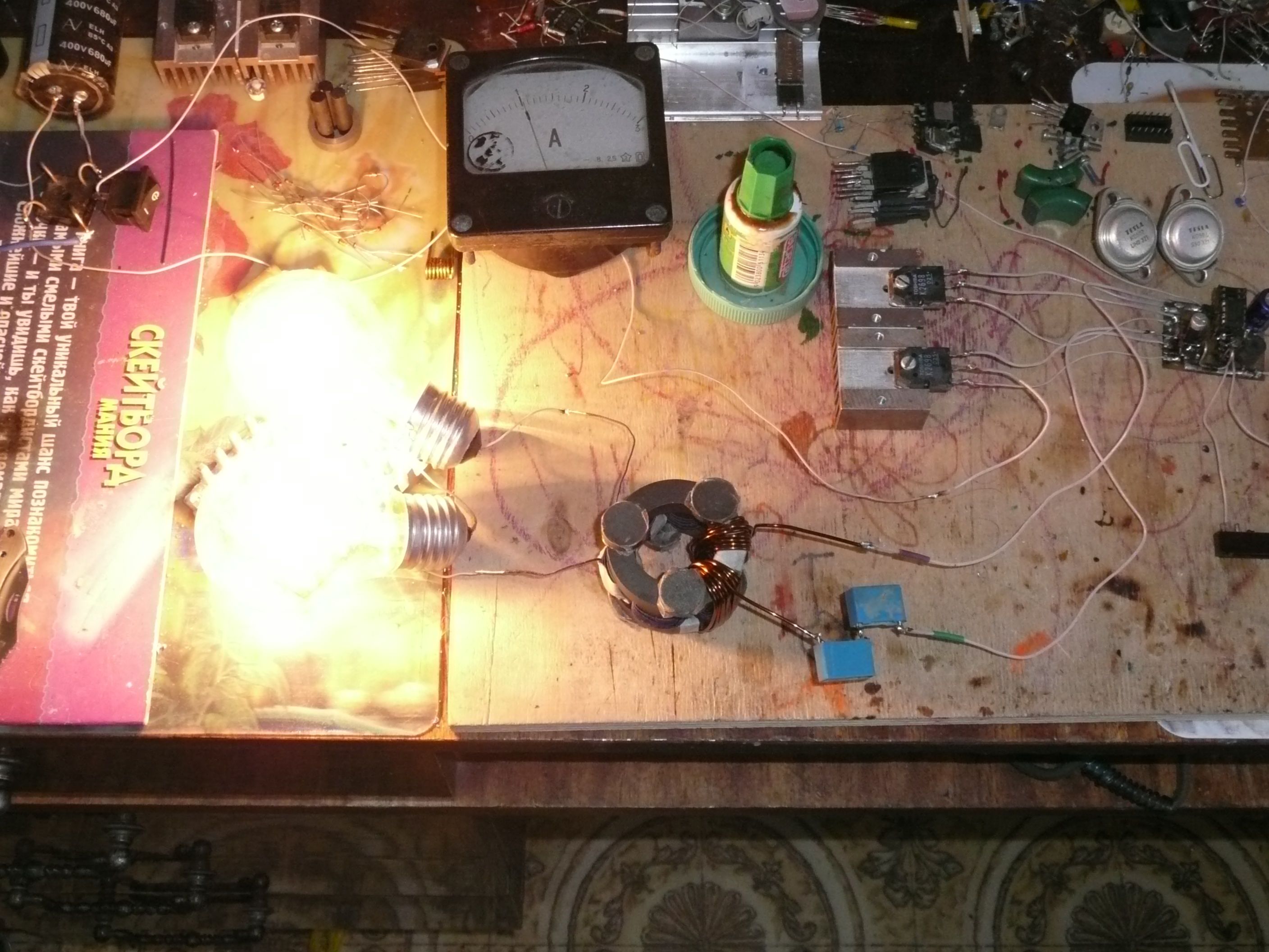 Работает как генератор, а не как трансформатор.Возбуждающая обмотка перпендикулярна выходной, напряжение с латра 80в, две лампы 75вт 220в последовательно,а вообще принцип описан в заявке..
