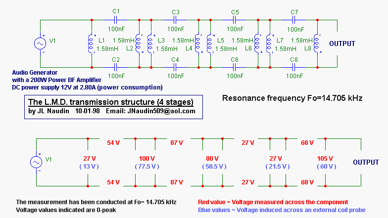 Напишу здесь, пожалуй. Сегодня от нечего делать собрал схемку Наудина, называется L_M_D-T_E_M. Рисуночек ниже. На входе 10 В, на выходе при хх 55 В. КПД около 80 %. Максимальный ток на выходе 25 мА. Намотал 4 катушки с левой и 4 с правой обмоткой на М400НН длиной 12 см и диаметром 1 см. Один плюс - начинаю понемногу разбираться как работает катушка. Раньше я, лох такой, думал, что на краях катушки разные полюса, а они одинаковые оказались :lol: По краям соленоида, намотанного по часовой стрелке, образуются северные полюса. А в центре южный полюс. Пока думаю, что можно сделать с соленоидом, намотанным двумя разнонаправленными обмотками. А именно, в том случае, когда магнит проходит мимо такого соленоида на феррите. Считаю, что в этом случае соленоид не рождает поля по краям и не вредит своей противоЭДС, если она здесь вообще есть. Мне не понятно одно: можно ли будет снимать энергию сразу с двух разнонаправленных обмоток, ведь они должны компенсировать поля друг друга :roll: Посоветуйте, как тут дело обстоит. Попробую завтра проверить.