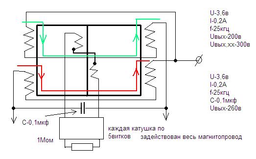 МЛЯТЬ ! НЕХОТЯ иду в мастерскую, восстанавливаю схемку(глаза,б мои её не видели !!!!! Вешаю обмотки (всего то по 5витков) на соседние крайние керны. Включаю - схемка гудит устойчиво ! Записываю параметры в журнал - сам/себе удивляясь ??