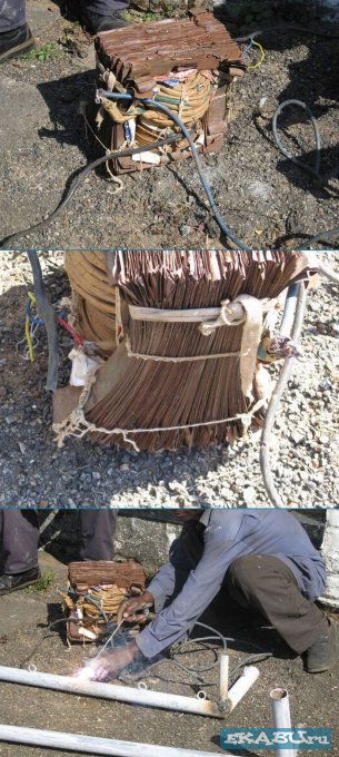 Транс представляет собой 3-х керновик с понижением 380(3-х фазки) на 36вольт. Обычно в таком трансе "умники"от электрики соединяют (как им кажется,- правильно!!) обмотки 2-х крайних кернов(причём как попало) и если чел."умный " т.е. он попал в фазировку то транс работает как надо. Обычное дело - не важно как сфазировать первичку - МП будет замыкаться либо через средний керн либо работать будут крайние керны и тогда средний керн не нужен и его можно безболезненно удалить , что в,общем то и делают умные люди(тем более, что подобные трансы собирают из полосок железа, а это очень удобно для подобной манипуляции).