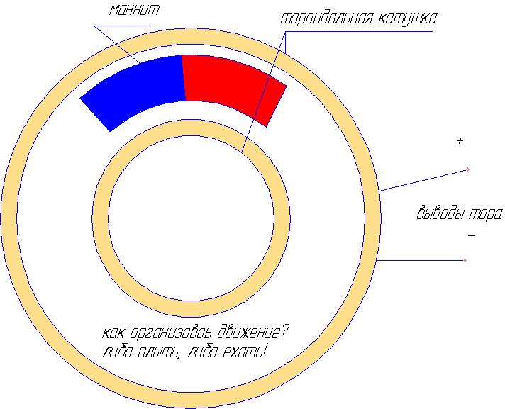 Второй вариант, это тороидальный магнит с замкнутым вектором намагниченности, установленный на роликах, между которыми с небольшим зазором над тором магнита намотана катушка, что бы у магнита не было затруднений при вращении на роликах. Здесь есть правда вопрос, будет ли магнитосцепление поля катушки с замкнутым полем магнита, но и здесь есть выход, это насечка на торе например в виде гофры или какой другой насечки, для выпуска части магнитных линий.