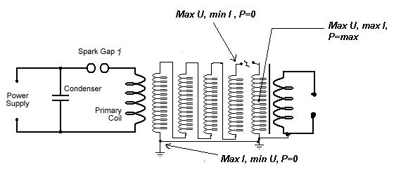 В схеме есть кстати небольшая неточность. Если следовать теории в изложени Теслы и объяснениям Стребкова, нижнего провод между обмоткой ВВ и понижающим трансформатором (съём заряда) быть не должно, иначе получается замнутый контур и включается классическая физика - начинаетс отбиратьс доп. мощность от катушки возбуждения, помимо активных потерь в меди ес-но. Вместо него должно быть два выравнивающих заземления и без гальванической связи мужду, но может я и ошибаюсь. Второе что нужно доработать - этот на выходе после разрядника подключить не напрямую к трансу а значимую емкость (лейденскую банку большой емкости, тк ничто другое не потянет десятки кВ) и после нее можно еще один разрядник, но в 5-6 раз меньше наряжением. Никакой алхимии - 2-я искра будет гараздо мощнее и реже частотой за счет промужуточного накопления зярядов на этой банке. Либо просто на емкость разряжаться, с которой ток снимать как с подзяряжающейся батарейки. Можно зарисовать и это вариант.