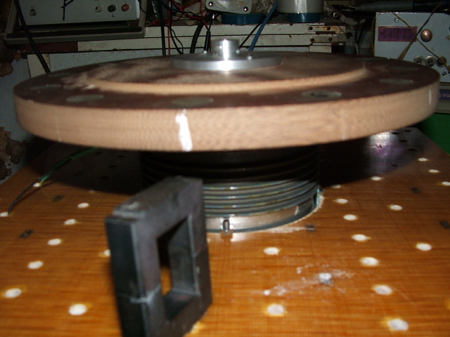 Фото)- магнитопровод склепный их двух п –половинок феррита, используемого для старых ч-б телевизоров. Увеличения тока нагрузки при вращающемся диске с нагрузкой при стабильном напряжении питания от Б5- 47 не обнаружено, как при одностороннем, так и при двухстороннем варианте с двумя дисками, при расстоянии магнитвоот магнитопровода 10,5- 11мм . Этот пример уничтожает критику, домыслы и утверждения про необходимость затрат энергии на перемагничивание магнитопроводов в данной конструкции. В настоящее время я получил убедительные данные, подтверждающие утверждения автора статьи (см. файл в начале темы), при одностороннем подводе магнитов к диску количество вырабатываемой энергии с одного магитопровода в 2 – 3 раза и более - больше, чем дополнительная энергия, возникающая в цепи нагрузки вращающего двигателя, это получено даже без тщательности уравновешивания обмоток. К примеру, на 11 ватт снимаемой с магнитопровода мощности, при одностороннем подводе магнитов, увеличение потребляемой мощности было 4 ватта. это при не очень высоких оборотах, примерно 2500. Если же учесть, что при этом несколько падали обороты и уменьшалось аэродинамическое сопротивление, то реальное соотношение 11/4 можно еще несколько увеличить. Вполне понятно, необходима тщательная балансировка катушек без магнитопровода, с последующей установкой - переносом каркаса на магнитопровод, что, надо отметить никто из участников форума не делал.