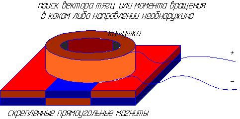 другой вариант. Сопротивление обмотки катушки при диаметре провода 0,35 - 6.7 ом, напряжение от латра через мост с электролитом к катушке, которое кратковременно подымал (2-3 секунды) до 50 вольт, ток до 7 с лишнем ампер. В обоих случаях, если магниты находятся вертикально, наблюдалось небольшое кручение в одну сторону, при не сменной полярности (так как магниты находятся в противоречии, а провода оказывались вертикально в верх, кручение списываю на взаимодействие подводящих проводов), других тяг замечено не было.