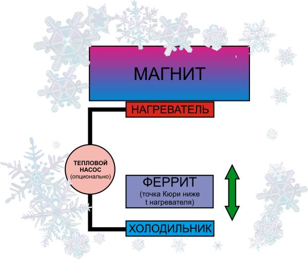 Вот простейшая схема. Феррит в холодном виде притягивается к магниту, рядом с магнитом нагревается до точки Кюри. Тут теряет свойство удерживаться магнитом, падает на холодильник, остывает и снова притягивается.