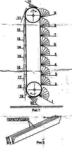 Допустим, в каждой камере по 100 кг жидкости. При ширине камер 20 см высота устройства будет примерно 2 м; к тому же мы разделим камеры на несколько частей- ячеек с помощью внутренних перегородок с клапанами (рис.2). Давайте на нашем примере камеры поделим на 10 частей –ячеек , из которых жидкость выдавливается строго поочередно благодаря клапанам.