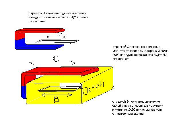 берём подковообразный железный магнит ,делаем прямоугольную рамку из медного провода шириной и длиной чуть меньше сторон магнита, подключаем к ней гальванометр и суём эту рамку в магнит между его сторонами.При движении этой рамки вдоль сторон магнита наводиться ЭДС и гальванометр это показывает.Далее берём железную трубку (экран), помещаем в эту трубку нашу рамку и помещаем это всё опять между сторонами магнита ,внутри экрана начинаем опять водить рамкой вдоль сторон магнита ,ЭДС при этом уменьшилась и зависит от экрана и от материала из которого он сделан ,НО если мы начинаем водить магнит относительно экрана и рамки в нём,то величина ЭДС наводимая в рамке такая же как будто бы экрана не было!