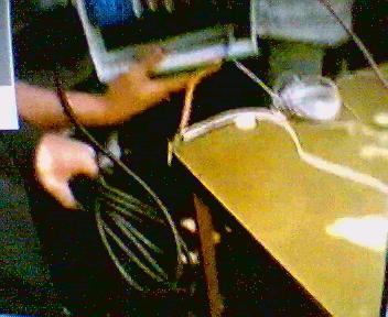 потом через специальную обувь ассистента через провод в рукаве - подсоединяется к....