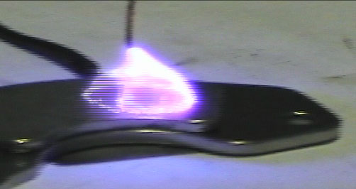 расстояние между заостренными частями этих керн 6 мм. сам разрядник просто на подставке сведены были два медных провода 1мм полщиной перпендикулярно кернам. разряжался все тот же конденсатор 1000п заряженый до 4 кв. на 4 витка толстого медного провода..после недолгой регулировки разрядник запел. если без него рашрядник работал шипяшим звуком то в таком примитивном магнитном разряднике издавал звук больше похожий на звук струны гитары частоту не мерял. эээ лампочка которая всегда в таких случаях подключеная к концам индуктора светилась ярче чем с обычным разрядником причем в цепи индуктора в этот раз было включено сопротивление 1к. только с ним магнитный разрядник издает музыкальный звук ну и я думаю что он в таком случае прерывает, без этого резистора видимо магнитному полю не хватает силы чтобы прервать разряд большего тока в дуге.