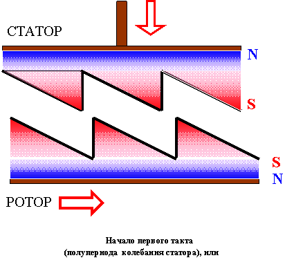 - в устройстве потенциальная энергия магнитного поля ротора и статора совершает работу циклично на два такта, соответствующих двум полупериодам колебания АКС, тем самым, магнитная энергия превращается в механическую, в кинетическую энергию вращения ротора.
