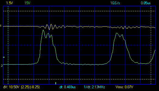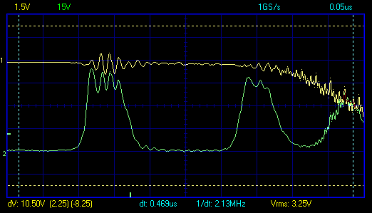 похоже прав Резонер – первый импульс в пачке узковат и вых. емкость не успевает набрать напругу и видим как кондер анода (2нф на 10ком) начинает заряжаться (рыжий канал) после доп.импульсов ..и задержка менее 200ns от макушки 1го имп. до пробоя не получается
