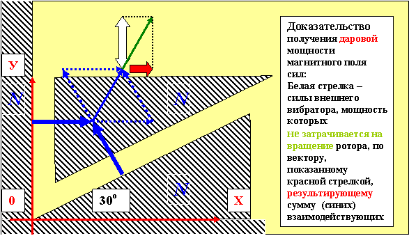 Повторю другими словами. Объяснение общей сути кинематической схемы механизма ВКМРП для реализации ПСМД в следующем. В обоих случаях и в действии архимедовой подъёмной силы, например, у аэростата и действие подъёмной силы на крыле самолёта происходит превращение волновой энергии радиационного давления автоколебаний элементов среды в массоперенос энергии потоком элементов среды (т. н. звуковой ветер) путем осуществления тангенциального разрыва скорости и давления потока среды на рабочем теле в результате асимметрии (силового треугольника).