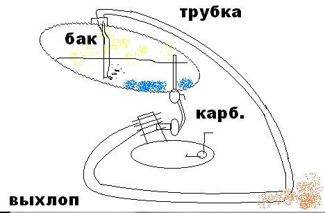 Типа как на рисунке, чтобы часть выхлопа попадала сверху в бак, или еще как вариант через краник через сеточку(мелкую, от искор или чего там) в бак поступает выхлоп, а забирать газ через пробку бака, Если подорвусь поставьте мне памятник😕