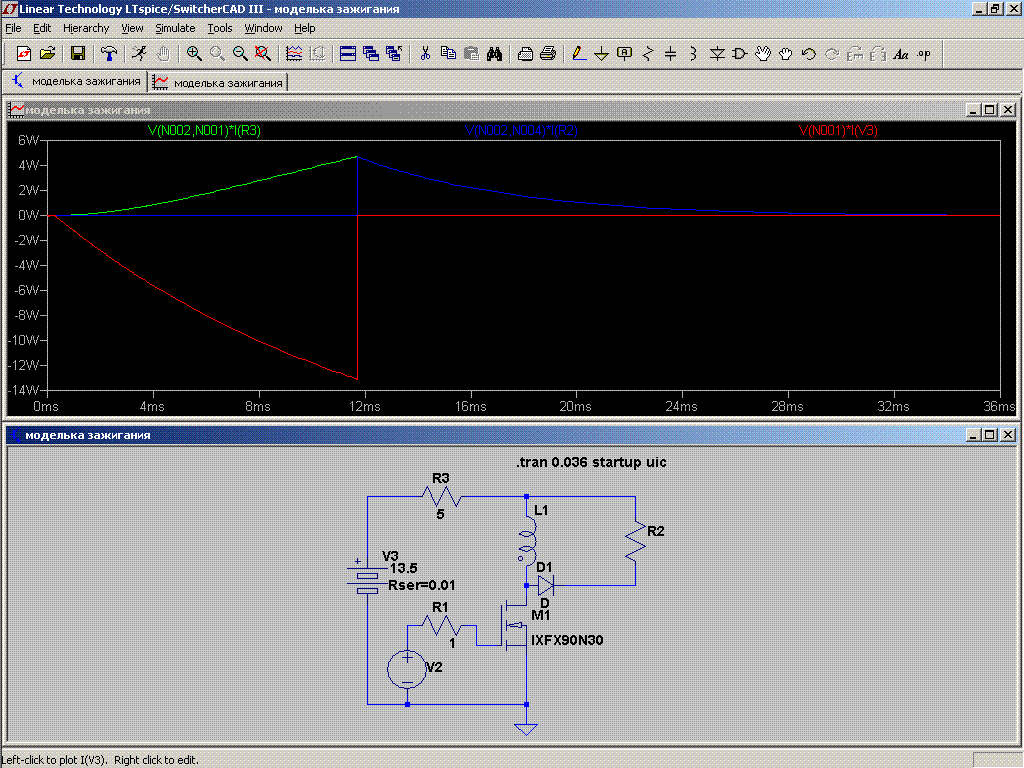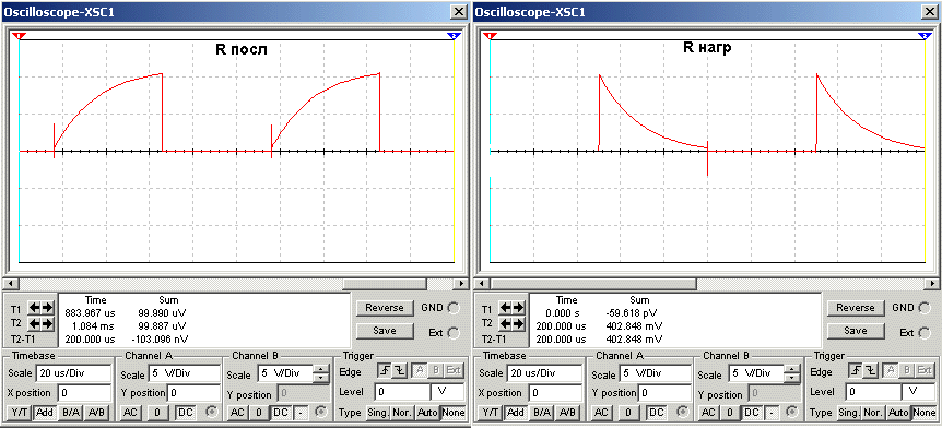 Во втором варианте индуктивность мала, возьмем 100 uH. Тогда форма импульсов кардинально отличается от прямоугольной, а становится экспоненциальной. Во время прямого хода ток быстро возрастает до 2 ампер и дальше держится на этом уровне, пока длится импульс накачки. Очевидно, эта энергия расходуется только на нагрев верхнего резистора, т.к. больше энергии индуктивность принять не может. На обратном ходе энергия индуктивности тратится на нижнем резисторе. Ток убывает экспоненциально и приближается к 0, и держится равным 0, пока длится импульс обратного хода. Так же очевидно, что, чем меньше индуктивность, тем больше будет разница в мощностях верхнего и нижнего резисторов, причем на верхнем всегда будет выделяться мощность больше.