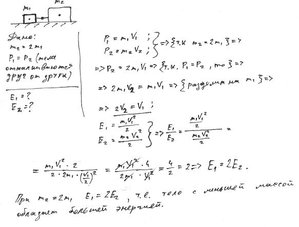 Кстати, про энергию. Разве будут разные энергии? E=mV^2. Если массы разные, то у меньшей массы V больше, а у большей V меньше, надо посчитать для конкретных значений и сделать вывод об энергиях тел. (мне лень! :wink: )