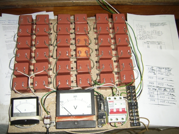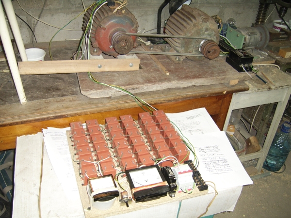 Для точного воспроизводства придерживался рекомендаций автора, но на стартер с регулировкой частоты вращения и зубчатыми колесами с точным модулем 2 уже сил и денег не хватило- решил немного видоизменить схему эксперимента- для обычного запуска от однофазной сети 220 вольт. Сложно было найти два одинаковых электродвигателя нужной мощности на столь низкую частоту вращения, и то не совсем идентичные нашлись- АО2-32-6У3 и 4АМ100L6. Двигатели пришлось доработать- вывести на клеммник все шесть концов техфазной обмотки. Двигатели закрепил болтами на толстом деревянном основании, натяг клиноременной передачи регулировал «качающимся» подрамником одного из двигателей. Шкивы были…ну какие были, с теми и экспериментировал. Замеры фототахометром показали такие передаточные числа – 1:1.13 в первом варианте и 1:1.045 во втором варианте. Блок конденсаторов 3 по 60 мкф собрал из 36 одинаковых металлобумажных конденсаторов МБГО-2 номиналом 20 мкф*300 вольт. Даже приборы поставил тех же серий, что описаны в патенте.