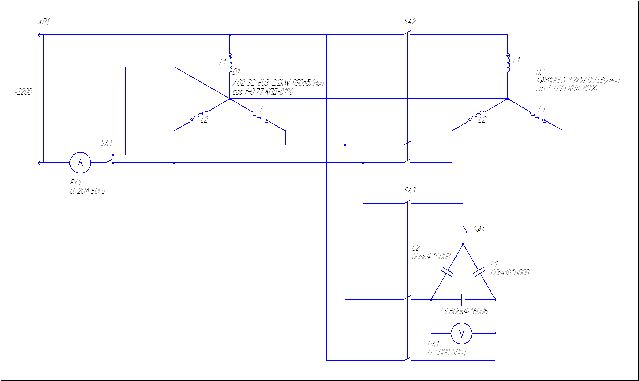 Итак, сама схема установки. Исходное положение- выключатель SA1 в нижнем положении, SA2 и SA3 замкнуты, SA4 разомкнут, ремень не натянут (свободно висит, но не соскальзывает со шкивов). Включаем вилку ХР1 в сеть 220 В. Легко заметить, что схема патента вырождается при этом в классический конденсаторный пуск трехфазного двигателя с суммарной емкостью пускового конденсатора в 90 мкф (тут, кстати, легко проверяется сонаправленность вращения валов двигателей в связке (незаслуженно опущенная в патенте деталь)- и если они вращаются в противоположные стороны, то надо обязательно пометять местами включение одной из фаз ОДНОГО двигателя, чтобы у нас получился именно генераторный режим, а не большой бабах). Двигатели раскручиваются, выходят на номинальные обороты. Ток потребления из сети у меня составил около 7 ампер. После этого натягиваем ремень (я просто опускал рычаг, видимый на фото, и массы двигателя в 37 кг вполне хватало, чтобы обойтись без дополнительных натяжителей). Ток практически не менялся. Дальше замыкаем выключатель SA4, и ток потребления из сети падает до 5 ампер, гудение моторов уменьшается, вольтметр РА1 показывает 300 вольт, частоты вращения двигателей составили 998 и 1044 об/мин (во втором варианте шкивов, в первом тоже ничего интересного). Дальше быстренько переключаем выключатель SA1 в верхнее положение, и у нас проявляется классика в запуске трехфазных двигателей- фазное напряжение вырастает до паспортных 220 вольт, линейное (на вольтметре РА1) увеличивается до 380…400 вольт. Правда, резко вырос ток потребления из сети- до 15 ампер, и двигатели натужно загудели. Обороты не ушли, все в соответствии с передаточным числом ременной передачи. По идее патента, где-то тут должна случиться халява, но я не понял как это должно проявиться. Ну и, в полном соответствии с формулой полезной модели, вынимаю вилку из розетки…
