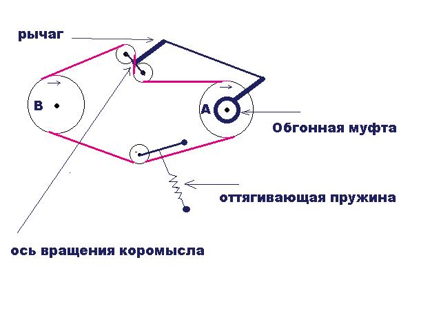 ... которая воздействуя на рычаг с силой, зависящей от скорости вращения, поворачивает коромысло на угол, "укорачивающий" цепь, пропорциональный требуемому в задании.