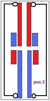 Если усложнить этот опыт, используя четыре попарно параллельных пластины (рис.3 – вид сбоку), то мы получим одновременный парный заряд четырёх пластин. Две верхних будут заряжены положительно, две нижних получат избыток свободных электронов. На рис.2 индукционные емкости для наглядности изображены между металлических пластин, на рис.3 – внахлёст («находят» на пластины). Принципиального значения это не имеет. Применение того или иного способа расположения обуславливается инженерным и конструкционным замыслом.