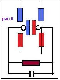 Наши диски остановятся при горизонтальном расположении пластин из-за взаимопритяжения пластин. Что бы этого не произошло, необходимо разрядить пластины в этой точке. Тем более, что горизонтальная ось является и осью электрической нейтрали. То есть, влияние двух индукционных ёмкостей в этой зоне скомпенсировано, и электрополе не будет препятствовать выравниванию («обнулению») заряда пластин. Небольшое перераспределение зарядов пластин в зоне, выделенной окружностью на рис.5, не повлияет на суммарные потенциалы пластин при их разряде и после него. Для разряда пластин можно так же, как и для заряда, использовать скользящие контакты. Токи разряда будут отталкиваться, значит разряд необходимо производить сразу после достижения пластинами горизонтальной оси. После разряда пластины по инерции вместе с вращающимися дисками продолжают движение к вертикальной оси для следующей зарядки.