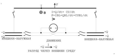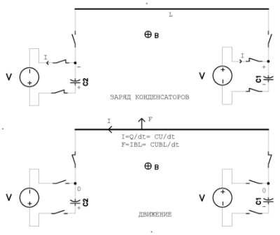 Отключаем источники питания от конденсаторов и замыкаем через силовой проводник выводы с противоположными знаками зарядов конденсаторов, при этом вторые выводы конденсаторов свободные(висят в воздухе). Происходит разряд(ток) между этими выводами через силовой проводник. Теперь энергия заряда конденсаторов составляет E2= (C/2)(2U)2/2= CU2, а заряд конденсаторов составит Q2= (C/2)2U= CU, т.е. заряд конденсаторов уменьшился на Q=Q1-Q2=Q2=CU или через силовой проводник прошёл ток величиной I=Q2/dt=CU/dt и возникла сила движения равная F=IBL= BLQ/dt= BLCU/dt, В-магнитная индукция внешнего МП, L-длина силового проводника, C- ёмкость конденсаторов, U- напряжение на конденсаторах, dt-время разряда. Следовательно всё устройство получило "безопорный" импульс силы движения, т.к. такая же противосила (-F) приложена к источнику МП, а не к устройству.