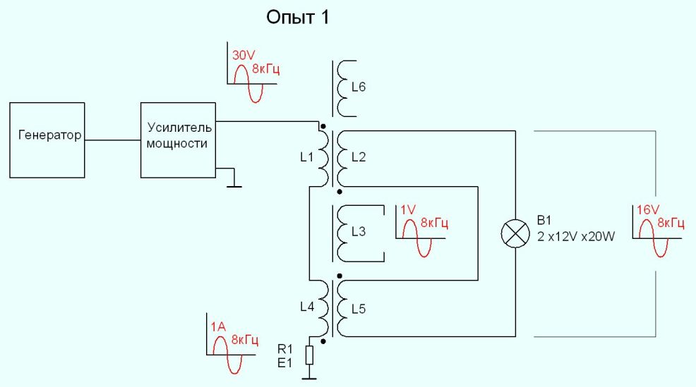 С усилителя мощности подавался сигнал 30 вольт частота 8кГц на входные обмотки. На вторичные подключалась нагрузка - две лампы по 20W на 12 вольт последовательно.
