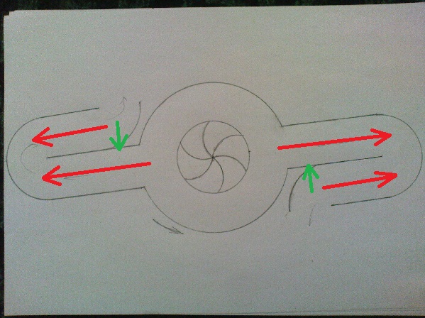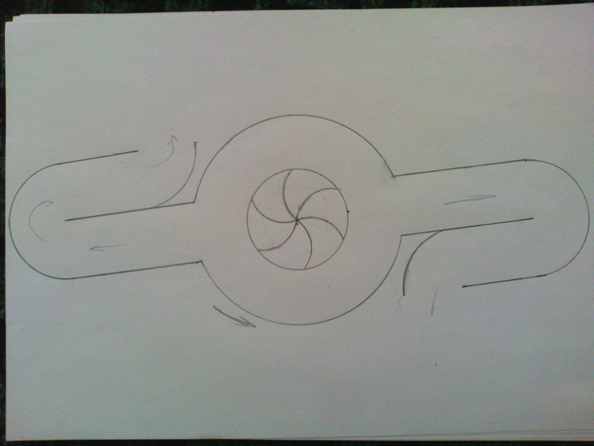 Хорошо, для начала рассмотрим более простую конструкцию (извиняюсь не художник). Практически это две трубы вертикальная осевая и горизонтальная заглушенная с торцов , в качестве сопла рассматривается обычное отверстие (пока не буду касаться практических вопросов, как например, изначально конструкция будет заполнена водой, а просто примем этот факт что в ней уже есть вода) Сразу скажу для 10квт этот вариант будет не оптимален я бы его условно оценил до 1квт. Для 10 квт вместо горизонтальной трубы лучшие параметры даст пустотелый диск с перегородками для сцепления с водой или не две а более 4 , 6 , 8 радиальных труб в зависимости от того, что вам покажется проще в изготовлении. Если необходима еще большая мощность при максимуме компактности, например двигатель для авто то самой оптимальной формой будет конус, это обусловлено сечением подводимого потока к соплам исходя из неразрывности потока sv=sv, увеличивая сечение подводимого к соплу потока и уменьшая сечение сопла мы увеличиваем гидростатическое давление перед соплом и тем самым увеличиваем скорость струи и одновременно уменьшаем динамические потери подводимого потока. При помощи конуса сечение подводимого потока можно сделать неизменным.