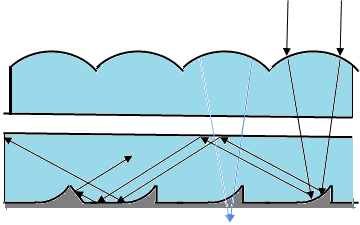 Свет проходит сквозь первое стекло, собираясь в сходящиеся пучки, входит, практически полностью, и в зеркало, но там попадает на параболические части, и отклоняется в сторону. Все - свет заперт С одной стороны зеркало, с другой - поверхность стекла, но под острым углом - тоже зеркало, В левой части рисунка нарисовал "клин" для возвращения света - излишен. Лучше как и остальные - перпендикулярно, тогда грани будут работать как катафоты, запуская свет под тем же острым углом, что и парабола "заслала" - дойдя до зеркального торца он один черт вернется. Вырваться из ловушки может только незначительная часть, что повторно попадет на параболы, но поигравшись с геометрией, можно этот процент к минимуму свести.