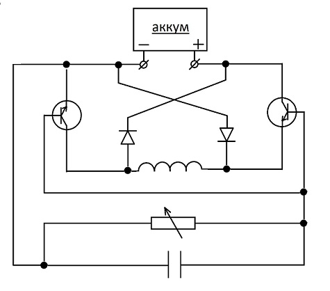 принципиальная схема автозарядного устройства. как по-вашему, будет работать? цель - выделить обратный импульс и загнать его обратно в аккум. такое соединение транзюков работоспособно?
