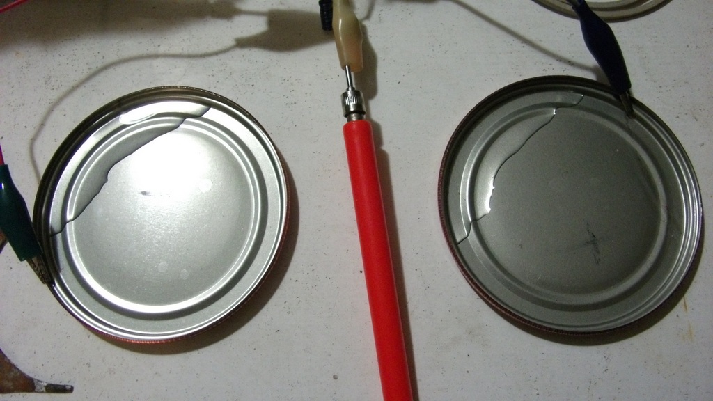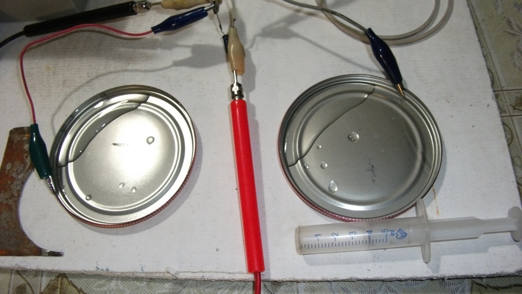 "Даваю" 😊. Напруга, приблизительно та же. Подключил АКБ к "зарядному". Провод заземления, к "аноду". В качестве двух "железок" - две крышечки, для закатки домашних овощей и хруктов😊. В обе, налито по четыре "кубика"😊, обычной водопроводной воды. "Процесс" начался в 18оо, по местному времени. Будем "посмотреть"😊.