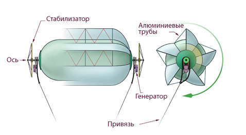 Размеры такого аэростата могут быть достаточно крупными. Но и "батареями" эти устройства будут не дорогими - ни мачт, ни больших вращающихся лопастей там нет.