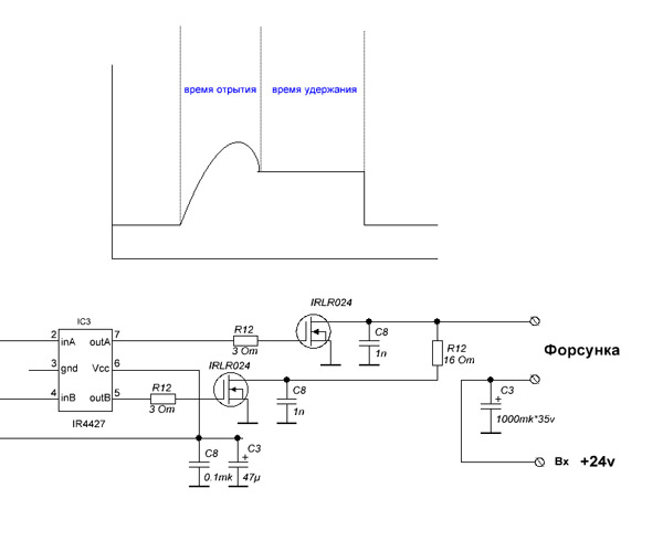 Управление форсункой осуществляется в два этапа, Первый я назвал Открытие форсунки, второй Удержание форсунки, открытие это коммутирование полевым транзистором 24 или 12 вольт от встроенного на плату DC/DC преобразователя напрямую в течении 450мкс, время будет еще уточняться опытным путем а вот время удержания это поддержание небольшого тока через второй транзистор которое позволяет просто удерживать сердечник форсунки открытым а при закрытии транзистора магнитное поле рассасывается быстрей что позволяет более точно дозировать топливо.