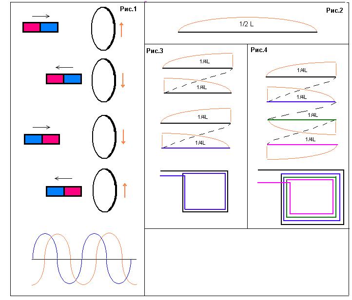 Что бы лучше понять взглянем на рисунок 1. Простой школьный опыт. К замкнутому кольцу подносят магнит попеременно то одним то другим полюсом (своего рода эквивалент синусоидальных колебаний). Либо постоянный магнит можно заменить на катушку запитанную переменным синусоидальным током. Ток в кольце (оранжевая синусоида) будет отставать на 1/4 периода. Магнитное поле кольца будет всегда стараться скомпенсировать изменение магнитного поля, вызваного движением магнита или изменением тока в катушке. Все как в школьном эксперименте. Теперь возмем некий проводник равный длине электромагнитной волны пропущенного через него переменного тока ( Рис.2 ). Изогнем его, как показано на рисунке 3. Предположим что штрих-пунктирная линия соединяющая конец первой половины проводника и начало второй половины проводника близка к нулю. В результате получаем, что электромагнитная волна в первой половине проводника отстает на 1/4 периода от электромагнитной волны во втором проводнике. Проще говоря ток во второй половине проводника наводит дополнительный ток в первой половине проводника, который совпадает с основным питающим током или говоря по другому, ток в первой половине проводника не испытывает на себе негативного воздействия от токов во второй половине проводника. А теперь чтобы уйти от мнимой длинны штрих-пунктирной линии, изогнем обе половинки проводника в круг (или квадрат как на рисунке). В результате получим бифилярную катушку Теслы с одним витком из обоих половин провода. Поразмыслив над результатом, сам себе задал вопрос. А почему бы бифилярную катушку сделать не из двух, а из четырех отдельных проводов, соединив конец каждого с началом следующего ( Рис.4). Эффективность такой катушки будет еще выше. Но у Теслы только два провода. Почему? Да потомучто во времена Теслы частота в 100 кГц была уже предельна. При такой частоте длина волны равняется 3км. Длина провода в такой двойной бифилярной катушке должна быть равна 1,5км. А из четырех и все 3км. Габариты просто не допустимые для того времени. Сейчас частота в 28 МГц не проблема для экспериментов и в домашних условиях. Длинна провода в такой катушке всего 10м ( четыре провода по 2,5м).