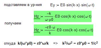 Из уравнения получается: dEy/dx=0. Т.е. вектор Е постоянен в направлении оси х. Это может быть только в одной точке синусоиды - в максимуме. Т.е. синусоиды Е и Н синфазны.