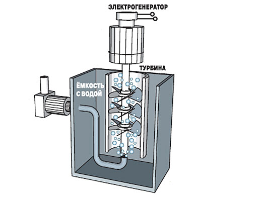 Что такое гидравлическая турбина, хорошо известно: поток воды давит на лопасти ротора (рабочего колеса) и крутит его. Механическая энергия вращения преобразуется в электрическую. А вот Василий Фотеевич изобрёл и запатентовал пневмогидравлическую турбину. «Пневмо» и «гидро» - это воздух и вода. Маркелов добавил к воде поток воздуха, а если говорить точнее - запустил его с помощью пылесоса «Вихрь» в экспериментальную бочку с водой, предварительно поместив туда модель своей турбины.
