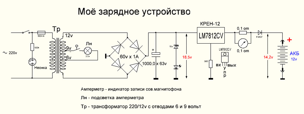 Вод, шо то "тут" НЕ ТАК😕. 15 В переменки на вторичке трансформатора, это - 15 В * 1,42 = 21,3 В постоянки на ёмкости 1000,0 МФ. На АКБ нужно 14,2 В. "Перепад" в 7 В, слишком уж "круто"😕. Этот АКБ будет заряжаться ВСЮ ЖИЗНЬ, пока весь электролит не превратиться в газы.