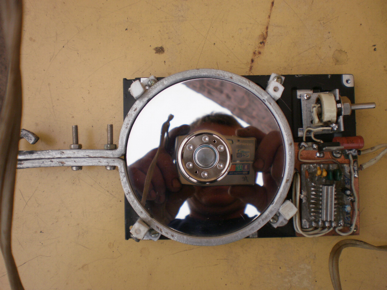 Намалевал.Кондер с 9 ноги уточняю-180000пф плюс -минус 30% все емкости.Эту схему я нашел и добавил стабилизатор на кренке с потенциометром для плавного запуска движка-эта микруха не любит резкого старта.Сверху-приклеил радиатор.Почему не родная схема? Не мог найти современного скоростного б.у. винчестера.Их все теперь дербанят-достают магниты,остальное на свалке.А старые не дают 8 тыщ оборотов.Подставка-диэлектрик.Сверху крышку из диэл.на стоечки обечайки,чтоб полиэтиленовый мешок не тормозил диски-5 шт., между ними прокладки из бумаги.Обечайка-шину обернул вокруг диска,подогнал зазор напильником и поставил на фторопластовые стоечки-вырезал ножом из листа фт.На двигателе-только обечайка,литье винчестера на диэл. нет контакта с массой.Ну, вроде все тонкости.Так вот думаю,может надо лить продырявить?