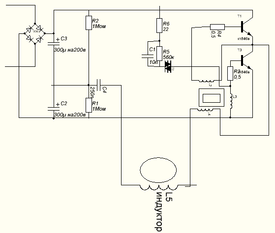 выкладываю схему индукционного нагрева. Я её использую для отопления дома. Схема упрощённая, здесь нет термодатчика, нет стабилизатора напряжения, максимальная стабильная мощность по этой схеме 500-520 Вт. Но лучше не превышать 470 Вт
