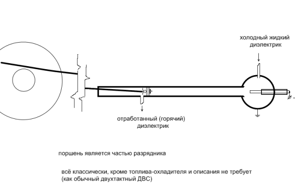 4 завершение цикла - по инерции же поршень движется в обратном направлении (ключ по питанию открыт), когда расстояние между электродом и поршнем меньше расстояния пробоя, происходит разряд;
