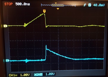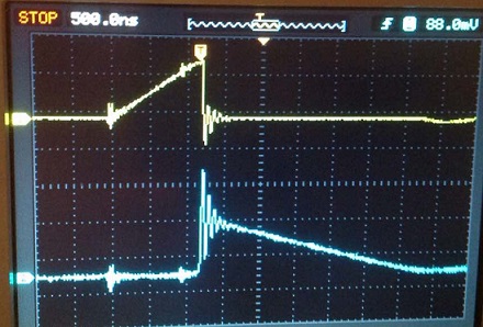 Это и видно на осциллограмме - желтая кривая после закрытия транзистора уже не такая вертикальная, как была раньше - ток продолжает течь на "+". Ну а в контур резистора электронов попадает меньше.